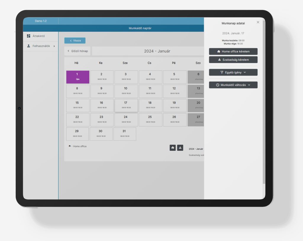 Szeretném bemutatni a saját fejlesztésű webes munkaidő nyilvántartó programot. A felhasználók létrehozása után, minden felhasználó igényelni tud szabadságot, home office-t, beteg szabadságot stb. Az ígényeket a beállításoktól függően egy felettesnek el kell fogadnia. A felhasználók egy külsős rendszerből automatikusan is érkezhetnek, egy erre a célra készített interfészen keresztül. Ezt minden esetben egyedileg kell egyeztetni. Az igényelt szabadságokat minden felhasználó könnyedén át tudja tekinteni különböző táblázatokban. A felület responsive, vagyis telefonon, tablet-en és asztali számítógépen is megfelelően jelenik meg.